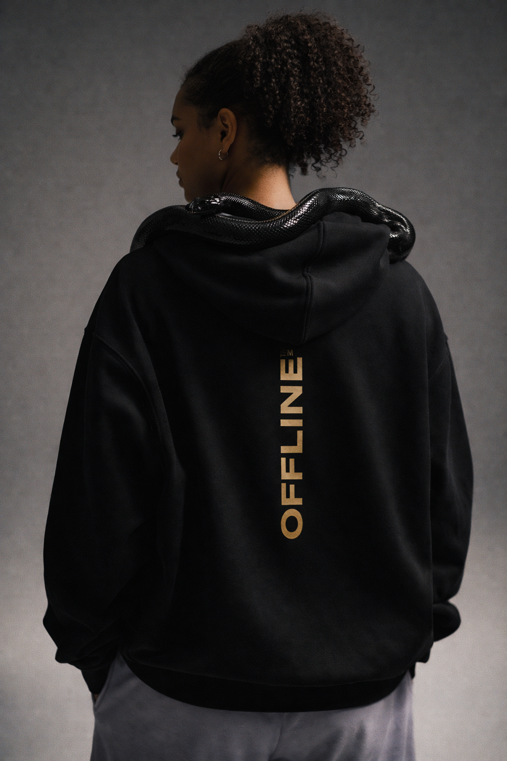 OFFLINE™was born as a refusal — a refusal to move at everyone else’s speed, to perform constantly, or to stay connected to what drains us. The snake has long symbolized awareness, patience, and rebirth; in our world, it represents control. Wrapped tightly, it carries the tension of modern life, holding pressure in silence. When it uncoils, that tension is released. That moment of release is where OFFLINE™ exists. OFFLINE™ is not about escaping the world, but about choosing when to engage with it.